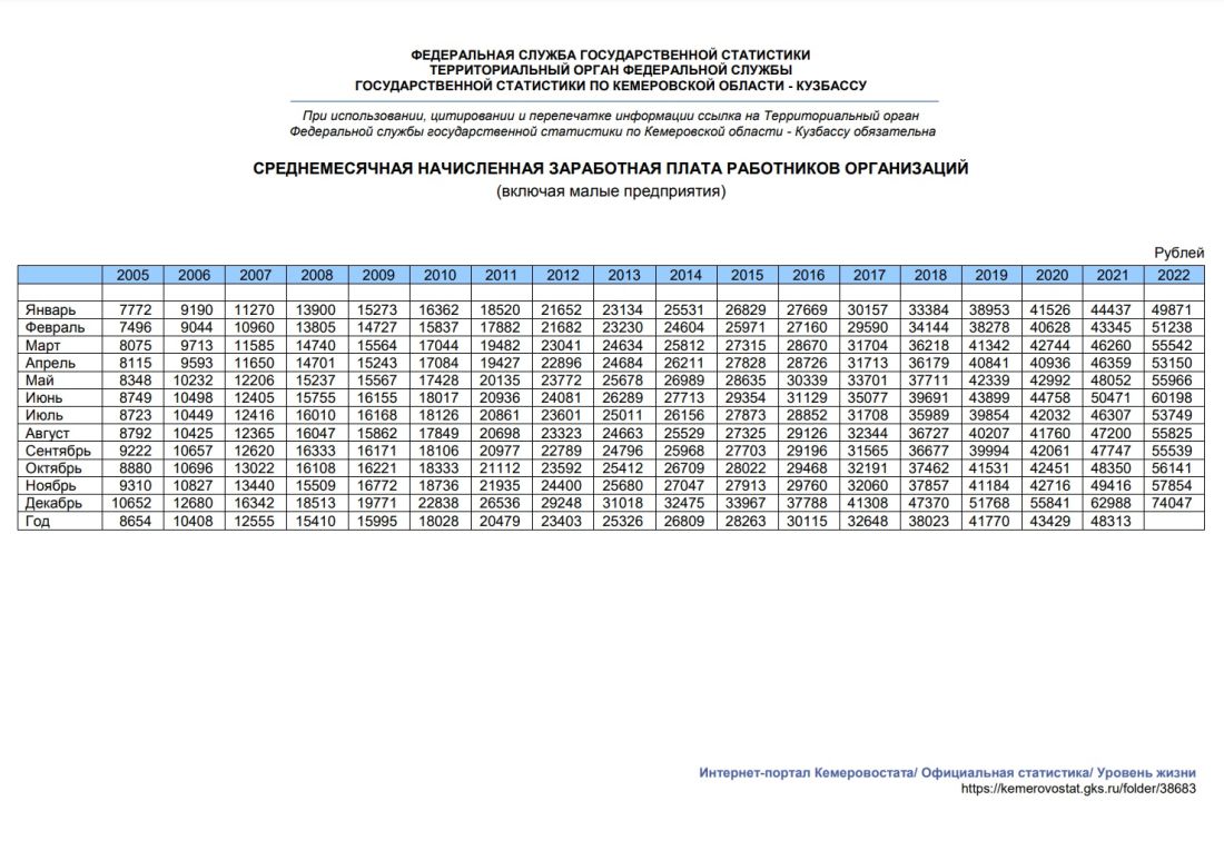По данным кузбасских статистиков , среднемесячная начисленная заработная плата работников в организациях Кузбасса (включая малые предприятия) за декабрь 2022 года составила 74 047 рублей и по сравнению с декабрём 2021 г. возросла на 16,8%.