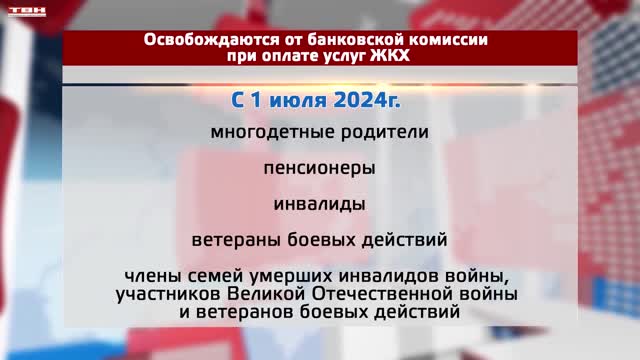 В результате с 1 июля текущего года многодетные родители, пенсионеры, инвалиды, ветераны боевых действий, а также члены семей умерших инвалидов войны, участников Великой Отечественной войны и ветеранов боевых действий освобождаются от уплаты банковской комиссии. Это же относится и к оплате пени при задолженности коммунальных платежей.
