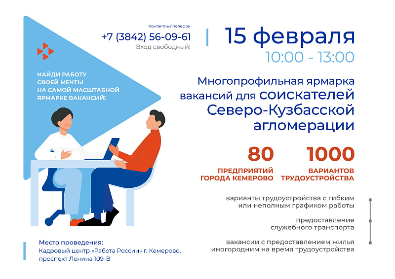 Ярмарка пройдет по адресу: город Кемерово, пр. Ленина, 109В (Центр занятости населения) с 10:00 до 13:00. В ней смогут принять участие все желающие соискатели Северо-Кузбасской агломерации. Тел. для справок: 56-09-61.