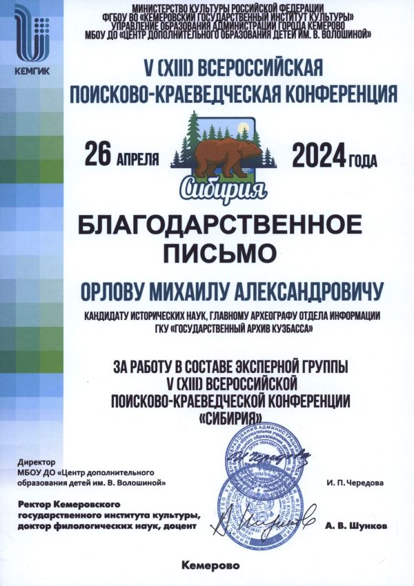 26 апреля 2024 года главный археограф отдела информации Государственного архива Кузбасса М. А. Орлов принял участие в работе всероссийской поисково-краеведческой конференции школьников «Сибирия» в качестве члена жюри секции «Историческое краеведение».
