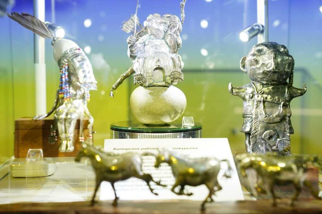 Центральным экспонатом стала эмблема Игр «Дети Азии» в Кузбассе, выложенная россыпью драгоценных камней. Эмблема размером 32х45 см состоит из природных алмазов (263,16 карат) и камней-самоцветов — топазов, хромдиопсидов, цирконов — общим весом 421,89 карат.