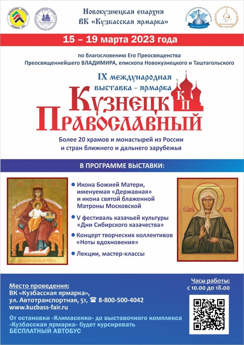 Выставочная компания «КУЗБАССКАЯ ЯРМАРКА» и Новокузнецкая епархия Русской Православной Церкви (Московский Патриархат) приглашают ВАС принять участие в работе IX Православной выставки-ярмарки «КУЗНЕЦК ПРАВОСЛАВНЫЙ» и V Фестиваля казачьей культуры «Дни Сибирского казачества», посвященных 375-летию монашеского служения на земле Кузнецкой