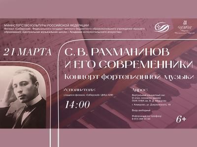 1 марта в 14:00 ч. в Государственной научной библиотеке Кузбасса им. В.Д. Федорова состоится концерт фортепианной музыки «Сергей Рахманинов и его современники". Свое творчество слушателям представят учащиеся кафедры специального фортепиано (заведующий кафедрой - Денис Олегович Трунов) филиала «Сибирский» Центральной музыкальной школы – Академии исполнительского искусства. Концерт посвящен юбилею великого русского композитора Сергея Васильевича Рахманинова. Зрители познакомятся с биографией, творчеством композитора и его современников: А. Лядова, С. Прокофьева, А. Гедике и других. Ведущая мероприятия – заведующая кафедрой теоретических дисциплин филиала «Сибирский» ЦМШ-АИИ Екатерина Александровна Городилова. Концерт пройдёт в видеоконференц-зале (3 этаж, основное здание библиотеки).