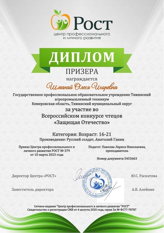 Студентка Тяжинского агропромышленного техникума Шманай Олеся, под руководством преподавателя литературы и русского языка Павловой Ларисы Николаевны, заняла призовое место во Всероссийском конкурсе чтецов "Защищая Отечество".