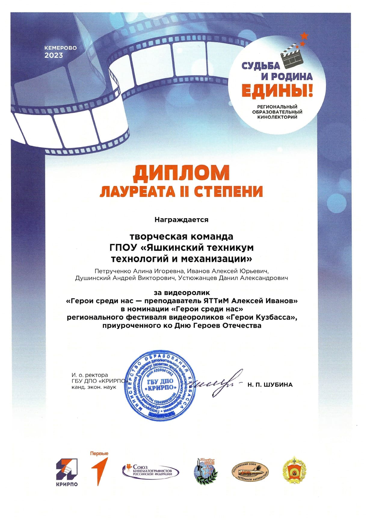 Творческая команда ГПОУ «Яшкинский техникум технологий и механизации» получила диплом лауреата II степени в номинации «Герои среди нас» за видеоролик «Герои среди нас - преподаватель ЯТТиМ Алексей Иванов»