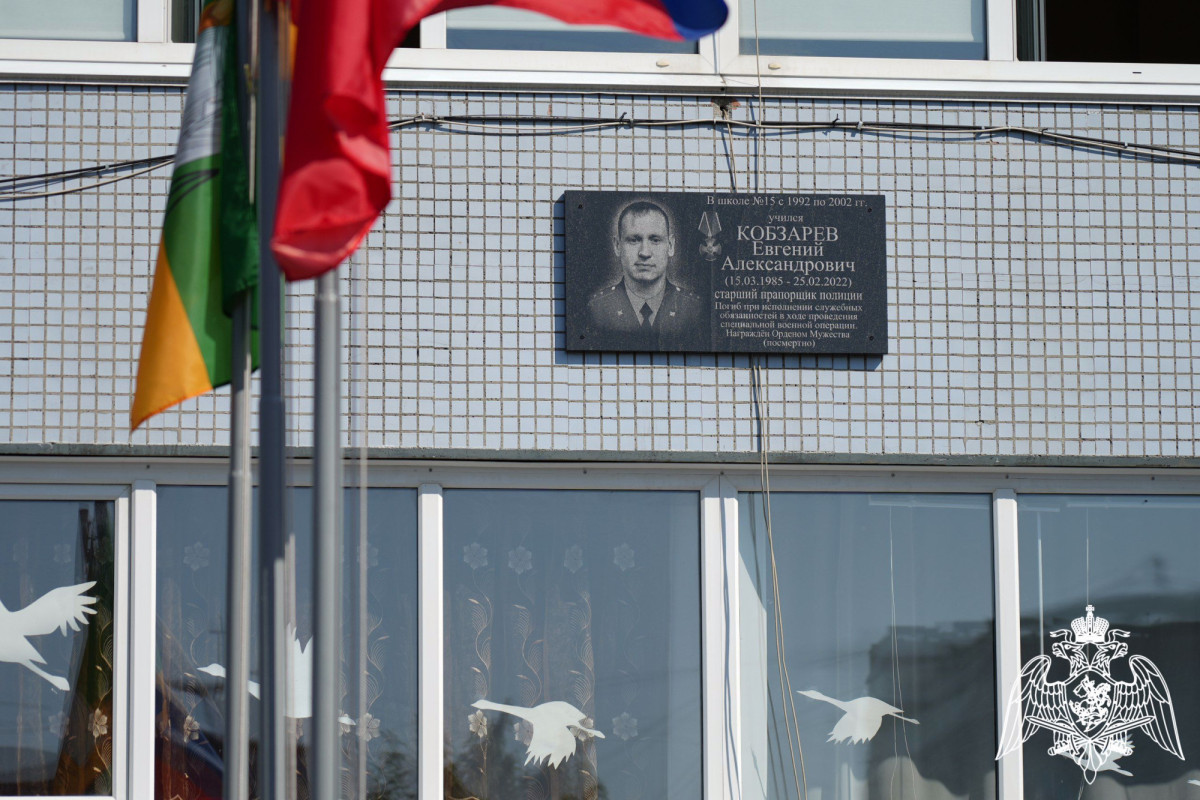 В Прокопьевске в школе № 15 состоялось торжественное открытие мемориальной доски в память о выпускнике школы, сотруднике ОМОН «Рубеж» Управления Росгвардии по Кемеровской области – Кузбассу, Евгении Кобзареве.
