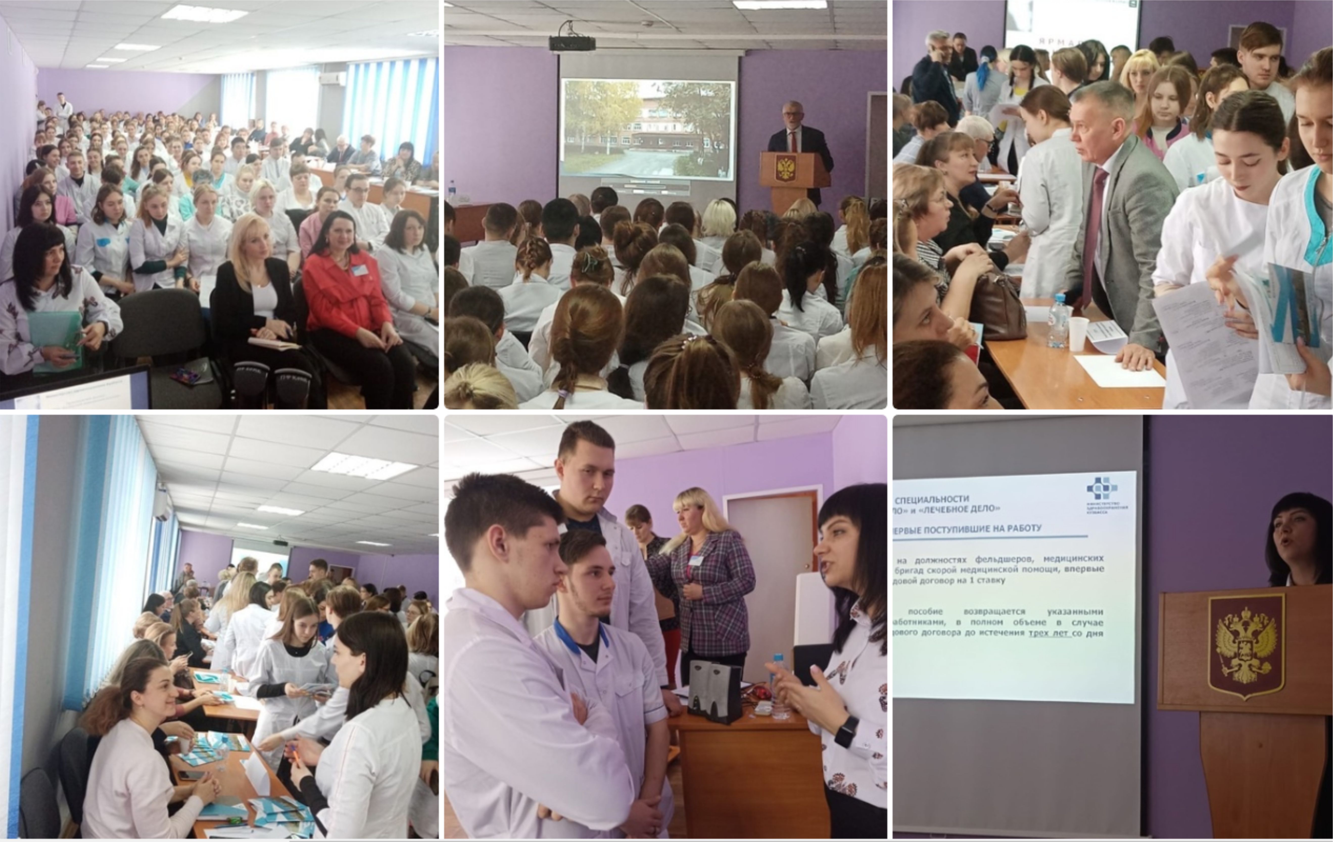 На мероприятии выступила начальник отдела кадров и государственной службы Министерства здравоохранения Кузбасса Ждан Маргарита Александровна, представив выпускникам информацию о социальных мерах поддержки молодых специалистов, системе наставничества, правилах трудоустройства выпускников, обучавшихся по целевому направлению, а также рассказала о возможности заключения договоров о профессиональной переподготовке на выпускном курсе для получения второй специальности за счет средств регионального бюджета.