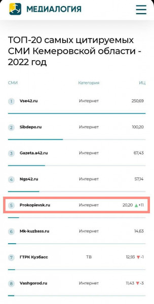 Данные независимой исследовательской компании "Медиалогия" регулярно показывают влияние в медиа среде не только чиновников, но и самых СМИ. Так, согласно опубликованным 10 февраля данным, Прокопьевск.РУ показал лучший результат в рейтинге региональных СМИ в 2022 году - мы поднялись сразу на 11 позиций.