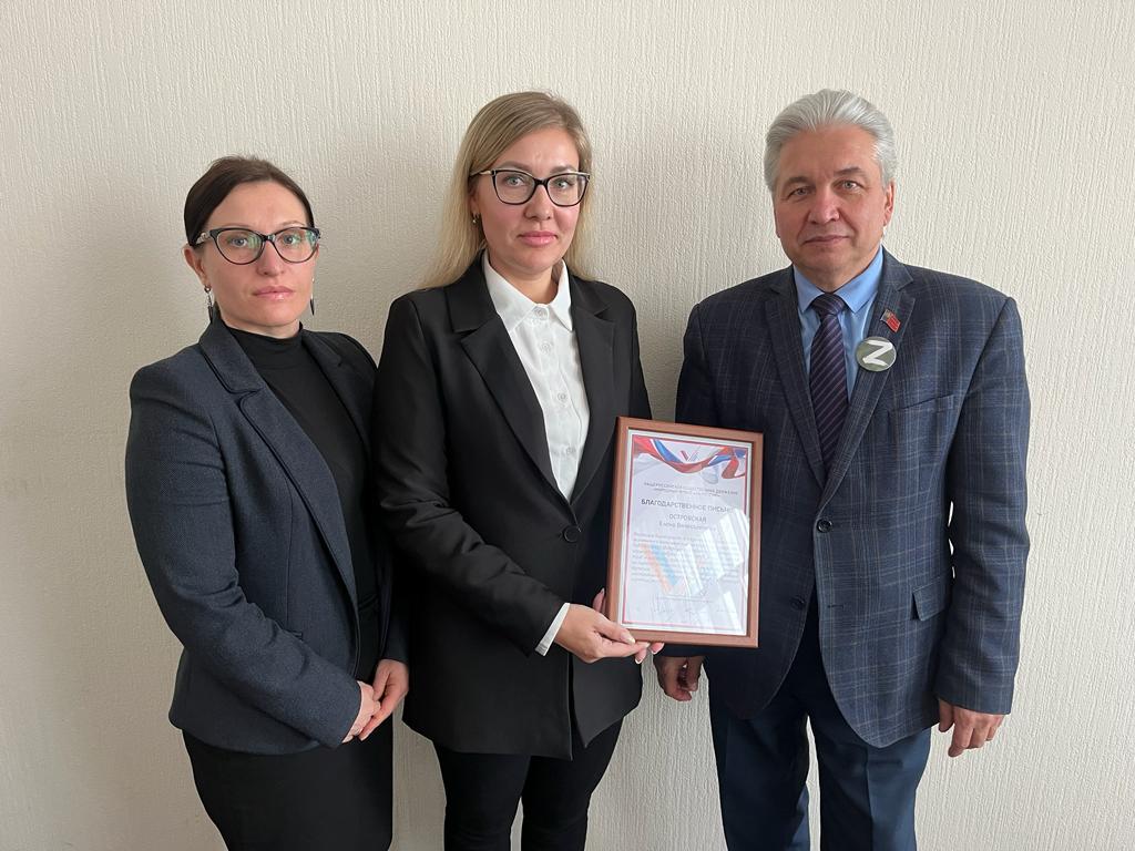 Письмо, подписанное руководителем федерального исполкома ОНФ Михаилом Кузнецовым, было вручено Елене Вячеславовне в знак признательности за вклад ведомства в поддержку гуманитарной миссии по оказанию помощи жителям Донецкой и Луганской народных республик.