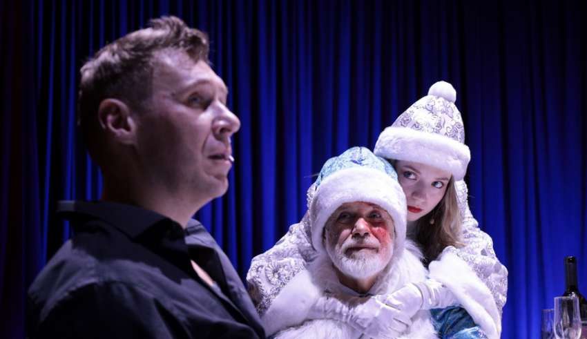 А спектакль – как и любой корпоратив – набирает обороты! Собравшихся веселят Дед Мороз и Снегурочка. Звучат тосты. Хлопает шампанское. Менеджеры и ведьмы-бухгалтерши (Татьяна Лизунова, Вера Заика, заслуженная артистка России Ирина Шантарь) играют в традиционную «Мафию», которая вдруг становится похожа на тайную вечерю, где крупным планом, на весь экран, появляются змеиные глаза Иуды-Макбета, а потом его ликующая улыбка и поправляющая картонную корону рука.