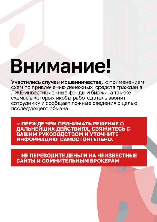 Появились новые схемы мошенничества, когда сотруднику поступает звонок якобы от имени работодателя, сообщаются ложные сведения с целью последующего обмана. Участились случаи мошенничества по привлечению денежных средств граждан в псевдо - инвестиционные фонды и биржи.