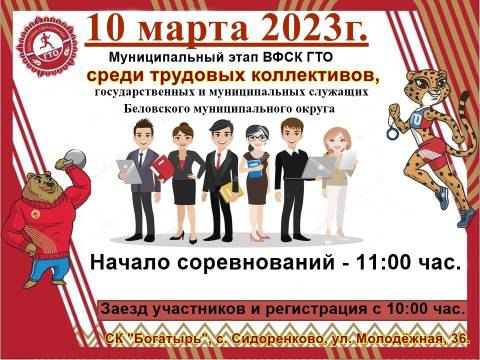 10 марта в 11.00 час. в СК «Богатырь» (с. Сидоренково, ул. Молодежная, 36) пройдет муниципальный этап фестиваля Всероссийского физкультурно-спортивного комплекса «Готов к труду и обороне» (ГТО) среди трудовых коллективов, государственных и муниципальных служащих Беловского муниципального округа
