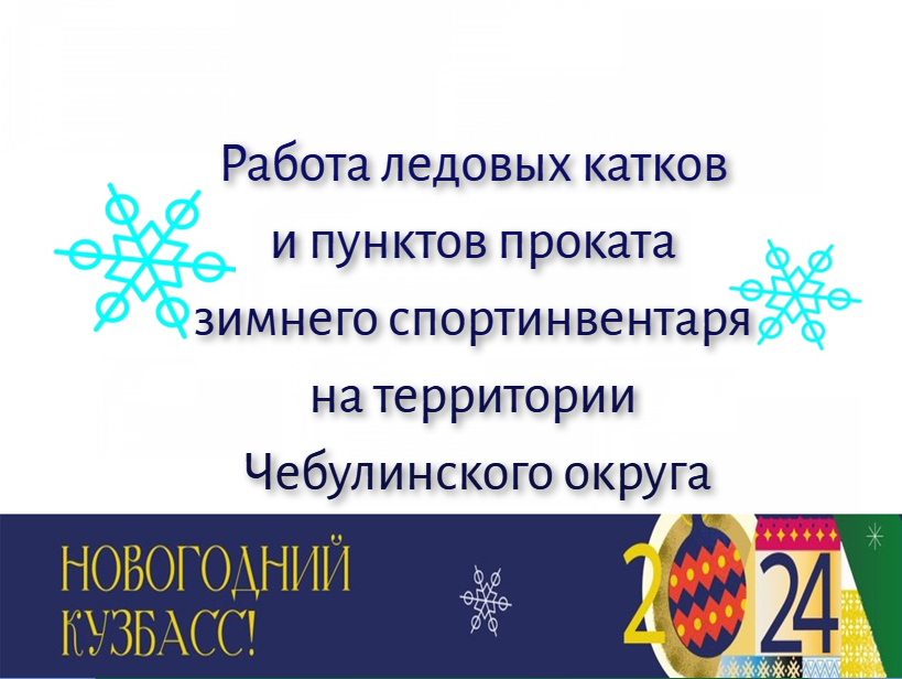 Дорогие друзья! На территории Чебулинского округа работают два открытых ледовых катка: территория Верх-Чебулинского КДЦ (ул. Советская, 105а) деревня Шестаково (поляна фестиваля) Там же организована работа пунктов проката зимнего спортивного инвентаря: Верх-Чебулинский КДЦ Вторник – пятница 13:00-19:00 Суббота, воскресенье 11:00-17:00 Праздничные дни 11:00-17:00 Стоимость проката (1 час) Лыжи взрослые – 150 руб. Лыжи детские – 100 руб. Коньки взрослые (в т.ч. хоккейные) – 150 руб. Коньки детские – 100 руб. Шестаково Среда - пятница 14:00-19:00 Суббота, воскресенье 12:00-19:00 Праздничные дни 11:00-19:00 Стоимость проката (1 час) Лыжи – 100 руб. Коньки – 100 руб. Плюшка – 100 руб. Ледянки – 50 руб. Семьи, относящиеся к льготной категории граждан, могут воспользоваться спортивным инвентарем бесплатно (при предъявлении документа, подтверждающего льготы, удостоверения личности). Льгота на прокат спортивного инвентаря действует для граждан, в том числе участников СВО и их семей, согласно спискам, предоставленным Управлением социальной защиты населения Чебулинского МО.Последние новости