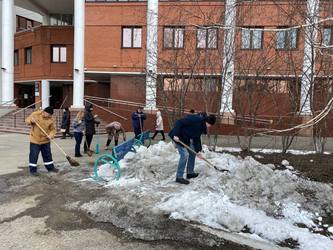 Сотрудники взрыхлили снег из слежавшихся сугробов, чтобы он быстрее таял. Кроме того, на солнечных местах они расчистили газоны от прошлогодней листвы, обработали клумбы и обрезали сухие ветки кустарников.