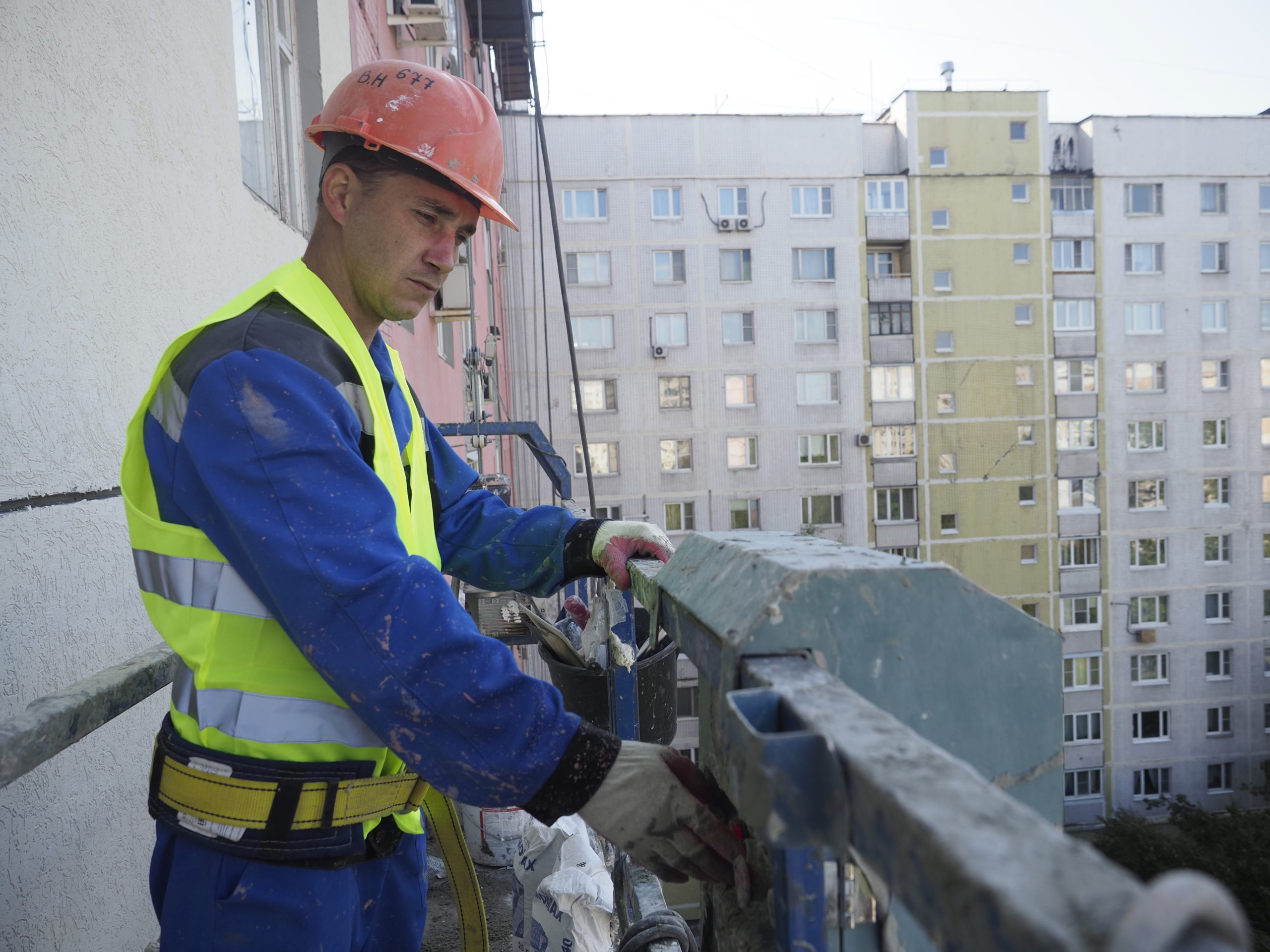 Абрамцевская улица, 9 Ремонт фасада по новой технологии. Фасадные рабочие Мухаммед Щеров ( с лестницы, с валиком) наносит грунтовку Дамир Кашапов (в люльке, наносит покрытие) Виктор Никишин (в люльке,