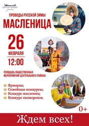 26 февраля в 12:00 на площади общественных мероприятий Центрального района для жителей и гостей города организаторы готовят богатырские бои, конкурсы на скорость в поедании блинов, спортивные соревнования, ярмарку с традиционной русской кухней и, конечно, традиционное сжигание чучела.