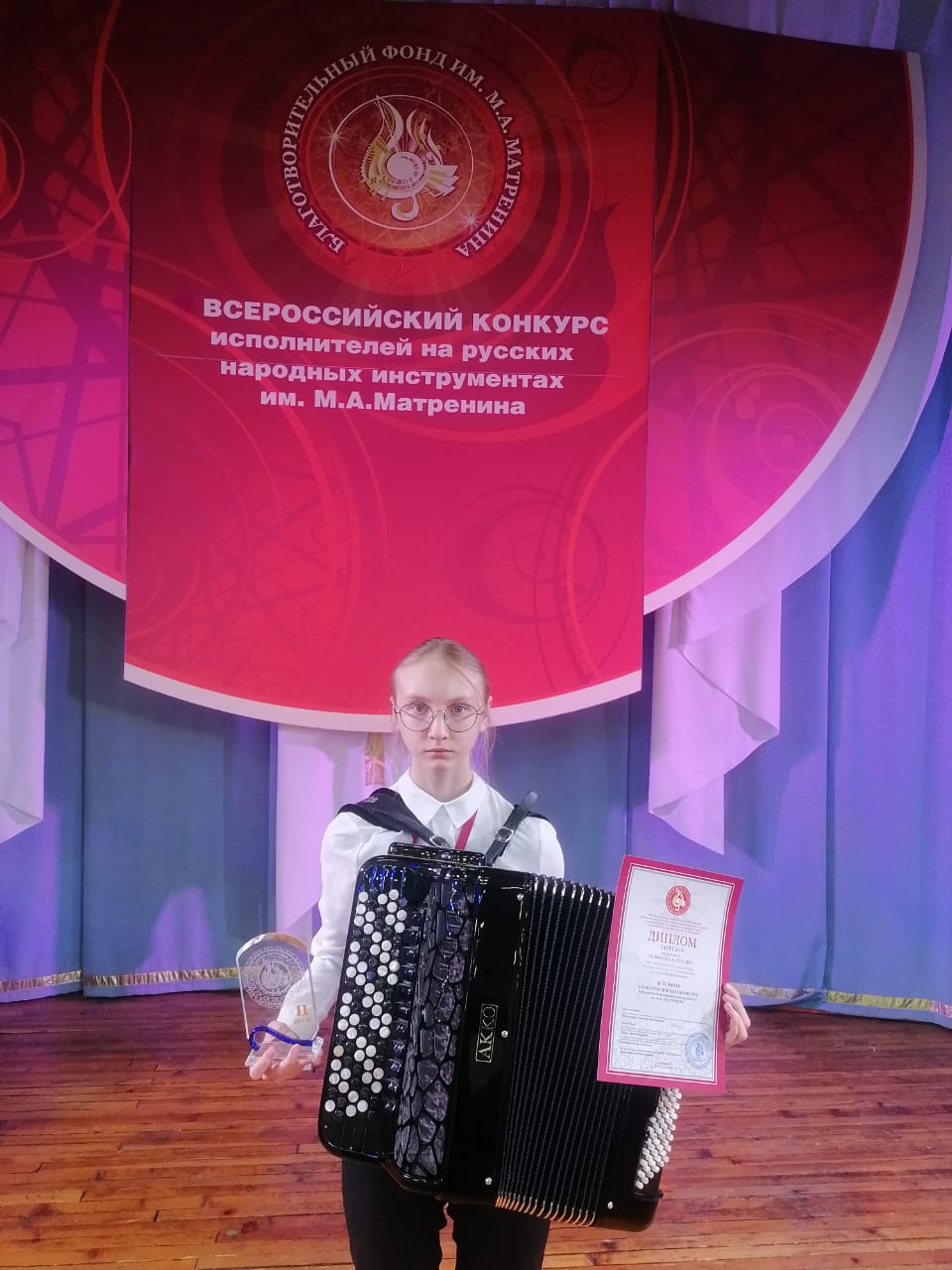 Алевтина Соловьева, учащаяся 6 класса Детской школы искусств им. В.И. Косолапова (преподаватель Юрий Серов), приняла участие в VI Всероссийском конкурсе исполнителей на народных инструментах имени М.А. Матренина. В конкурсе приняли участие более 70 учащихся детских музыкальных школ и детских школ искусств.
