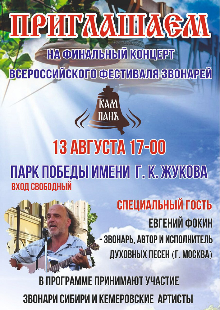 Завершится фестиваль двумя праздничными концертами. В Кемерове концерт состоится в парке Победы им. Г.К. Жукова 13 августа, начало в 17.00. Ожидается выступление Евгения Фокина, нескольких звонарей, кемеровских творческих коллективов.
