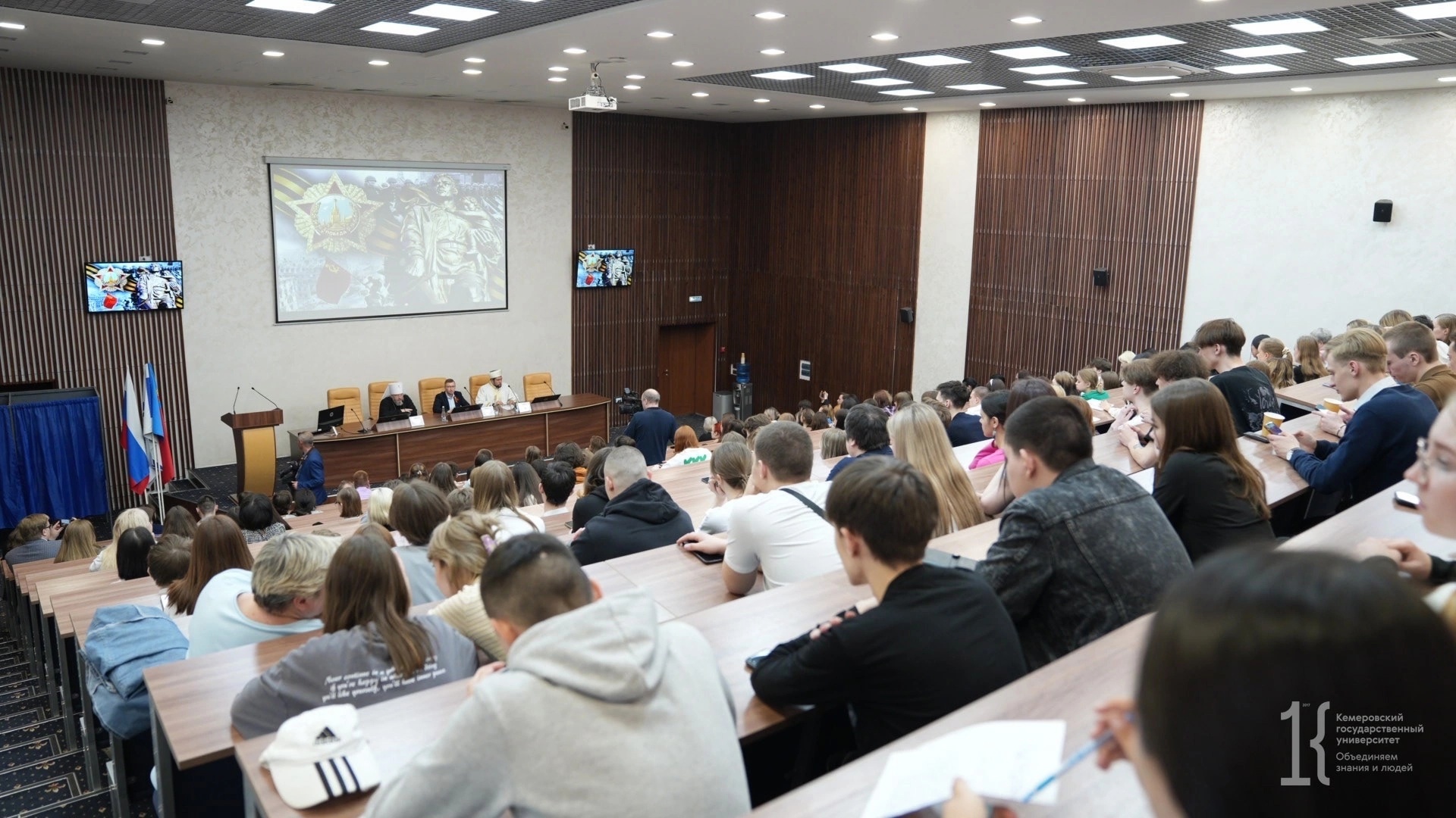 В преддверии Дня Победы со студентами Кемеровского государственного университета встретились митрополит Кемеровский и Прокопьевский Аристарх и муфтий Духовного управления мусульман Кузбасса Тагир хазрат Бикчантаев.