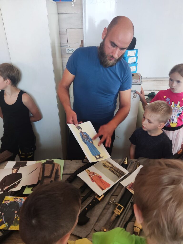 Знакомство с традициями и бытом казаков, казачьей одеждой и оружием сразу привлекло внимание отдыхающих: они с интересом слушали о шашках, саблях, бебутах и воспользовались возможностью испытать некоторые виды оружия. Атаман КРООСКК «Казачье братство» Алексей Андреевич Савин продемонстрировал учебные упражнения по рубке шашкой и фланкировке и предложил ребятам испытать свои силы, а воспитанники клуба СМБ «Пересвет» провели мастер-классы по интересным и зрелищным приемам.