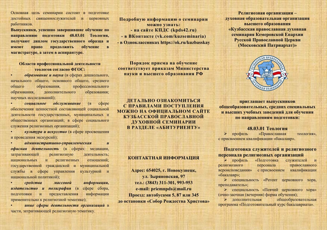 Кузбасская православная духовная семинария приглашает на обучение