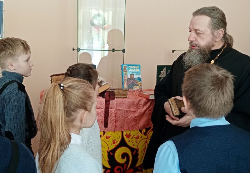 Ребятам была показана видеопрезентация «Апостол - первая печатная книга на Руси». Библиотекарь познакомила ребят с православными произведениями русских писателей: Л. Андреева, Л.Н. Толстого, Ф.М. Достоевского. Настоятель храма Серафима Саровского – иерей Сергий рассказал историю и значение этого дня в православной культуре, познакомил с божественной церковной литературой. Библиотекарь храма, Тамара Романовна Костенко, поведала о видах православной литературы, о чудесах, описанных в книгах. К мероприятию был оформлен открытый просмотр «Разумное. Доброе. Вечное», на котором были представлены православные издания фондов библиотеки-филиала №7 и библиотеки храма. Некоторые издания датированы 16-17 веками. Дети с интересом рассматривали старинные рукописные издания, задавали вопросы, на которые иерей Сергий давал исчерпывающие, подробные ответы. Завершилась встреча показом православного мультипликационного фильма «Путеводительница».