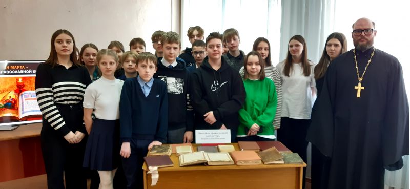 В этот же день старшеклассники «Гимназии №11» традиционно встретились со священнослужителем Троицкого храма, отцом Алексеем Павловичем Логиновым. Презентация книги Евгения Осетрова «Аз – свет миру» познакомила с историей русской письменности, отечественного книгопечатания. Отец Алексей разъяснил, чем православная книга отличается от всех остальных, рассказал об истории книг городского храма. Были показаны разные по времени издания книги, переписанные, сфотографированные и частично собранные людьми, которые старались сохранить православную книгу в тяжелое для веры и церкви время. Кроме того, священнослужитель рассказал школьникам, где можно найти и прочитать современную православную литературу. Закончилась встреча обзором-презентацией классической и современной духовной литературы, представленной на книжной выставке. Отец Алексей сказал о том, что в написании современных книг о боге и о вере принимают участие ученые и философы, показал ребятам православные периодические издания, призвал их читать книги. Традиционная встреча в библиотеке, посвященная православию и книге стала для школьников открытием очень нужной и интересной информации.