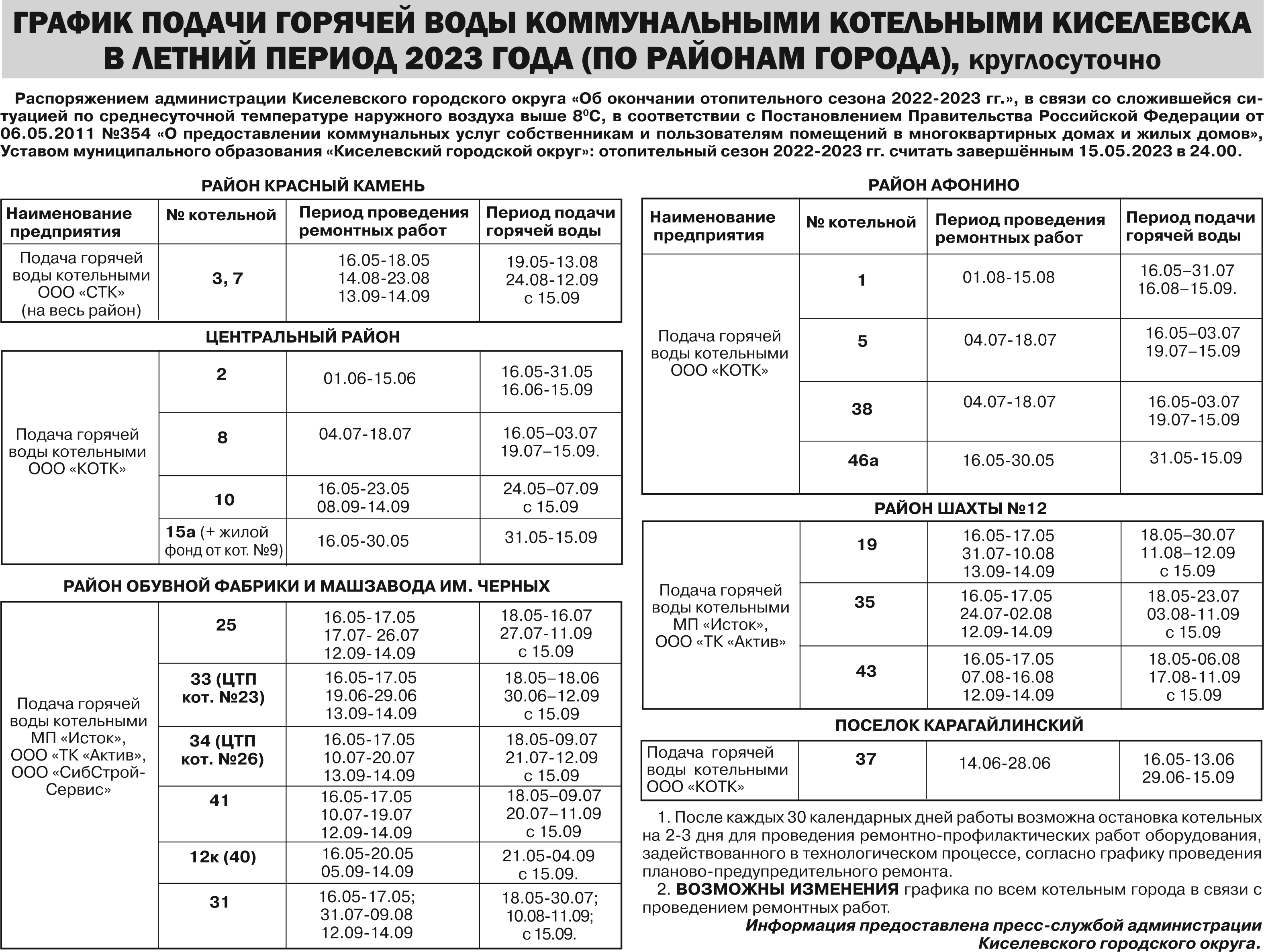 Распоряжением администрации Киселевского городского округа «Об окончании отопительного сезона 2022-2023 гг.», в связи со сложившейся ситуацией по среднесуточной температуре наружного воздуха выше 8 градусов, в соответствии с Постановлением Правительства Российской Федерации от 06.05.2011 №354 «О предоставлении коммунальных услуг собственникам и пользователям помещений в многоквартирных домах и жилых домов», Уставом муниципального образования «Киселевский городской округ»: отопительный сезон 2022-2023 гг. считать завершённым 15.05.2023 в 24.00.