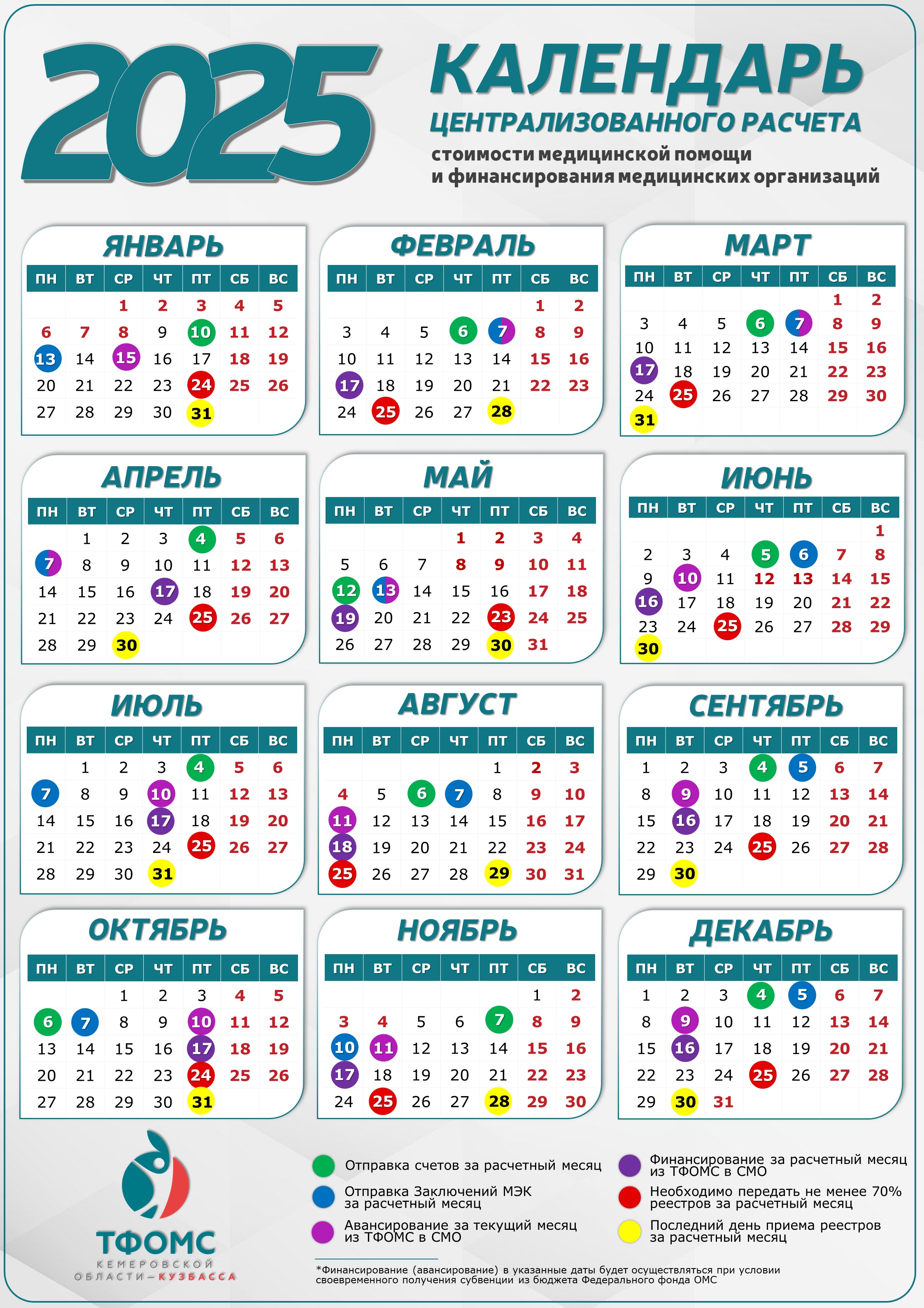 На сайте ТФОМС Кемеровской области – Кузбасса в разделе «Централизованный расчет» размещен календарь централизованного расчета стоимости медицинской помощи и финансирования медицинских организаций на 2025 год.