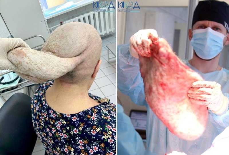 Женщина родилась с тёмным пятном, которое в течение жизни переродилось в новообразование. На момент операции в размерах оно достигло 20 на 35 см.