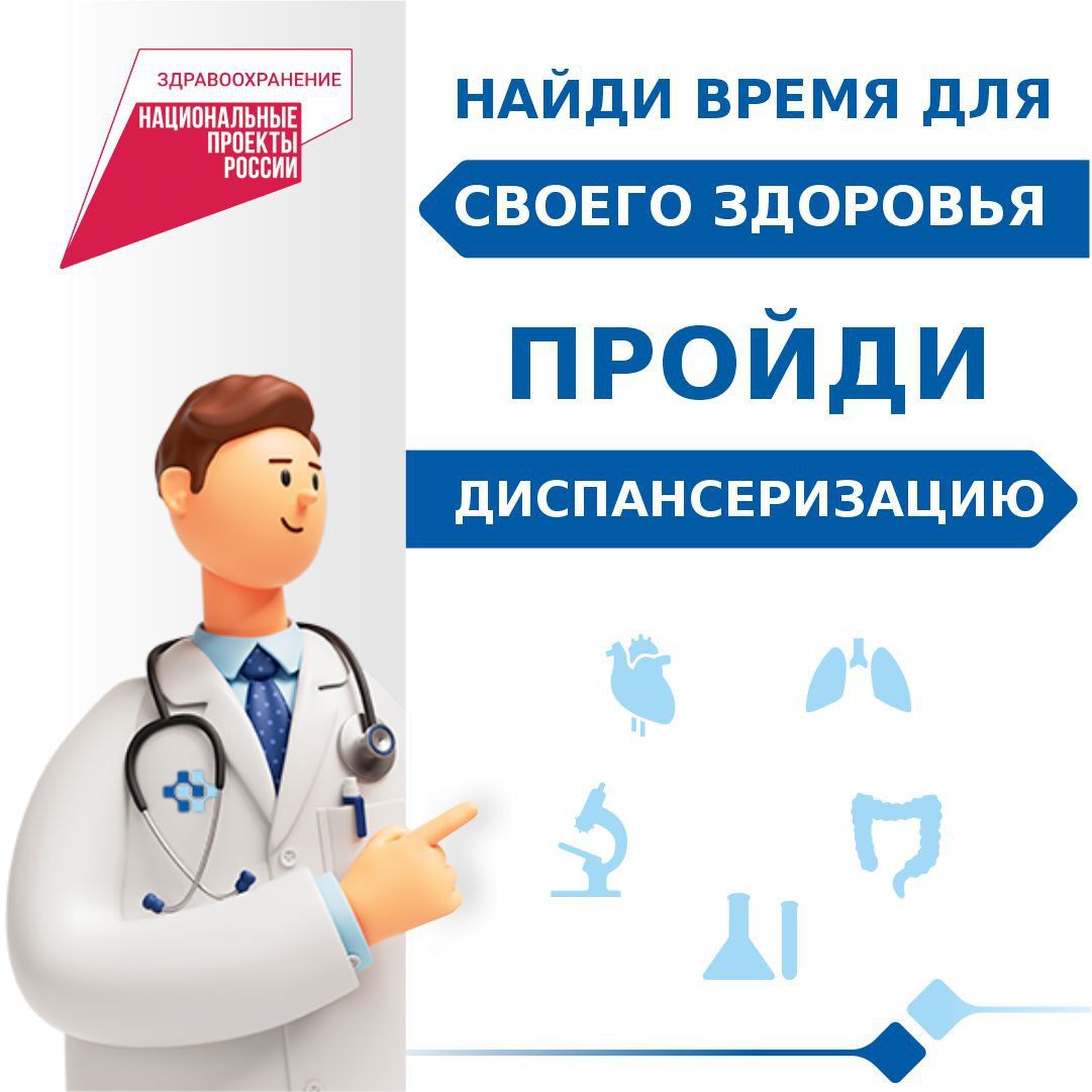 Берегите здоровье! Пройдите диспансеризацию! Благодаря нацпроекту «Здравоохранение», обследованию подлежат все граждане старше 18 лет!