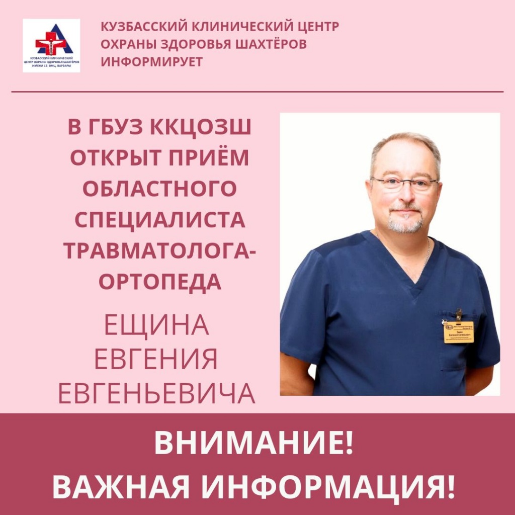 Уважаемые пациенты! В поликлинике ГБУЗ ККЦОЗШ открыт приём главного областного специалиста травматолога-ортопеда. Прием ведёт Ещин Евгений Евгеньевич, кандидат медицинских наук, и.о. главного врача ГБУЗ "Кузбасский клинический центр охраны здоровья шахтёров имени святой великомученицы Варвары", врач - травматолог-ортопед Адрес: Поликлиника для взрослых г. Ленинск-Кузнецкий, ул. Микрорайон 7, д. 9. Часы приёма: вторник 12:00-14:00 Запись по телефонам: 8 (384-56) 2-40-76, 8 (384-56) 7-66-03