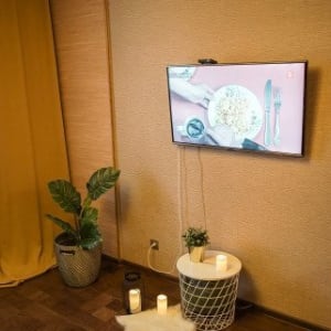 Бытовая техника (стиральная машина, чайник, микроволновая печь, холодильник, духовой шкаф, утюг и фен). Посуда для приготовления пищи Средства личной гигиены (шампунь,мыло и гель для душа) Гладильная доска и сушилка.