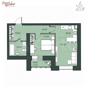 Современная двухкомнатная квартира-студия. Светлая кухня-гостиная, уютная спальня с балконом. В просторном холле предусмотрена вместительная ниша под гардероб.