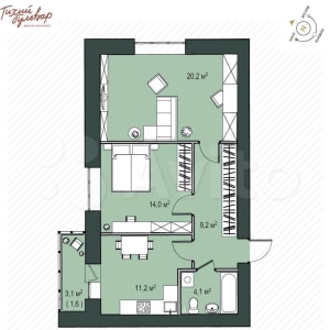 Функциональная классическая двухкомнатная квартира с просторной жилой комнатой, светлой спальней и вместительной кухней с выходом на балкон. В холле предусмотрена ниша под гардероб.