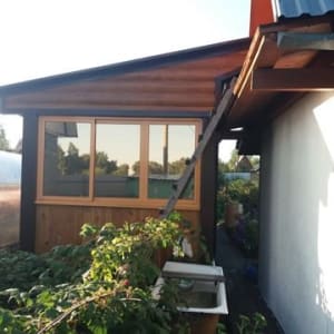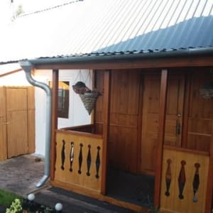 металлическим сайдингом,внутри отделана вагонкой и кирпичём,