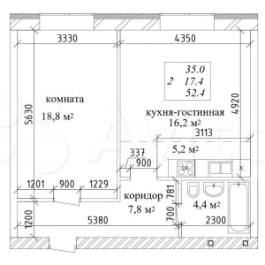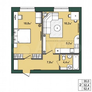 - Общая площадь: 52.4 м²